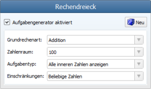 Mit dem Aufgabengenerator lassen Zahlenraum, Aufgabentyp und zusätzliche Einschränkungen einstellen: