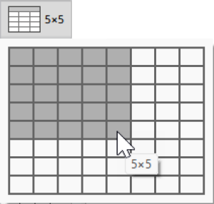 In der Werkzeugleiste gibt es das abgebildete Symbol für Tabelle. Ihr könnt es mit gedrückter Maustaste aus der Werkzeugleiste auf das Arbeitsblatt ziehen und an der gewünschten Stelle fallenlassen (Drag & Drop), oder mit der Maus auf das Feld in der Werkzeugleiste klicken. Daraufhin öffnet sich ein Fenster in dem ihr die gewünschte Größe auswählen könnt. Bewegt die Maus darüber, um die Anzahl an Zeilen und Spalten zu ändern. Mit einem Klick bestätigt ihr die Auswahl. Ein weiterer Klick ins Arbeitsblatt legt die Tabelle an.