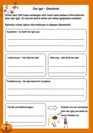 Auf der nächsten Seite findet eure Klasse einen weiteren QR-Code. Dahinter versteckt sich noch mehr Wissen über das Stacheltierchen. Mit diesen Infos benennen die Kinder die Körperteile des Igels (Seite 8) und können den Igel-Steckbrief auf Seite 9 ausfüllen. Im Anschluss kann eure Klasse dann noch ein eigenes Lernplakat erstellen.
