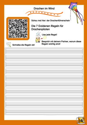 Der Herbst ist wie gemacht zum Drachensteigen lassen. Wir haben für eure Klasse alle Regeln für den Drachenführerschein hinter dem QR-Code auf Seite 16 versteckt. Eure Kinder schreiben die Regeln ab und tauschen sich dann mit einem Partner darüber aus, warum sie so wichtig sind.