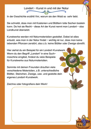 Wenn im Herbst die Bäume ihre Blätter und Früchte abwerfen, ist die beste Jahreszeit für ein Kunstwerk mit Naturmaterialien. Mithilfe unserer Erklärung auf Seite 14 erfahren die Kinder, was Landart genau ist und gestalten im Anschluss ein eigenes Kunstwerk aus ihren gesammelten Schätzen.