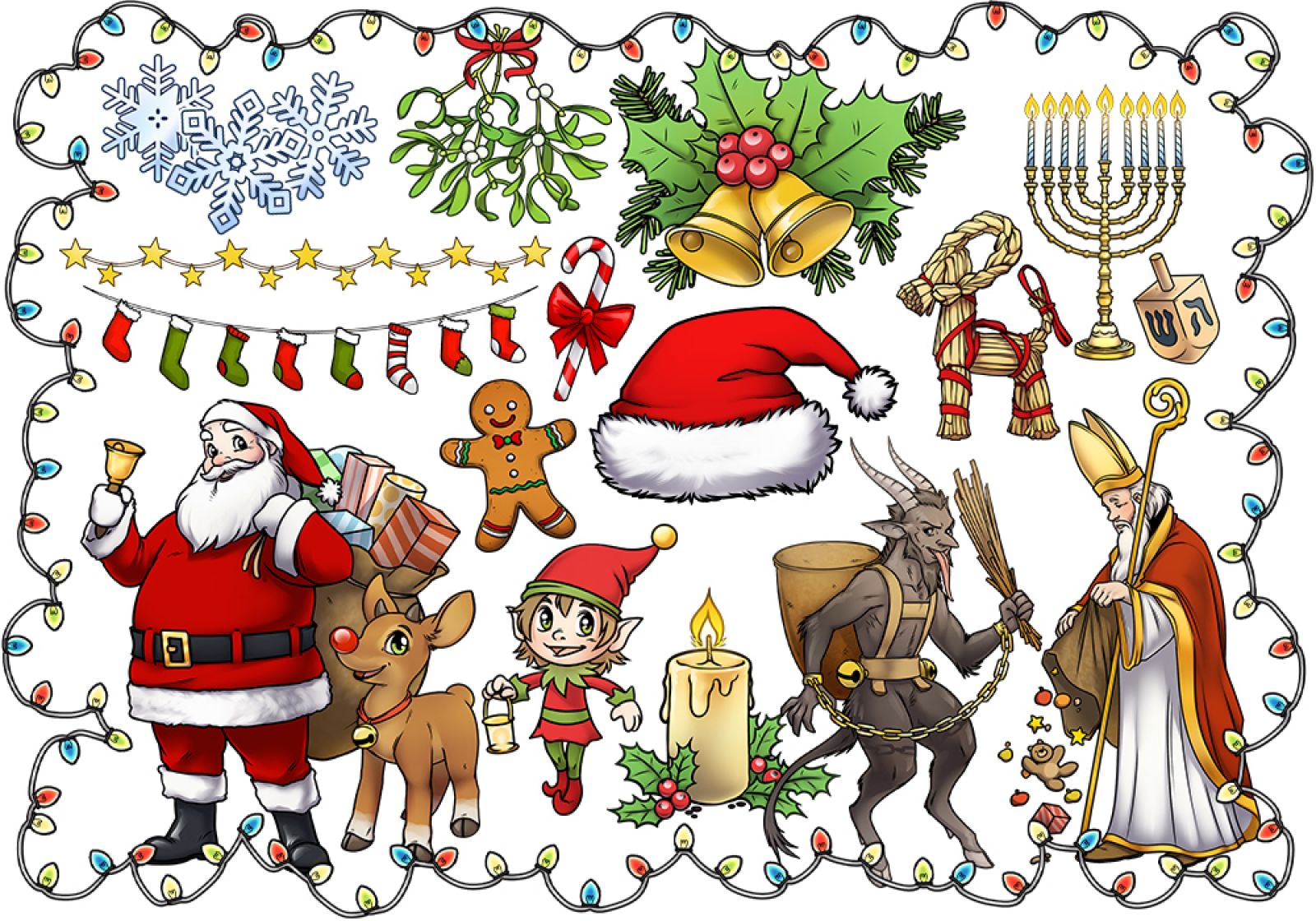Das Paket „Winterfeste: Nikolaus, Weihnachten und Chanukka“ bietet euch zahlreiche Illustrationen zu den Winterfesten wie zum Beispiel Nikolaus und Krampus, Chanukka und Julfest. Auch passende Girlanden und Schmuckrahmen sind dabei.