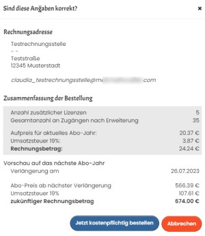 Das Zahlungsziel von 30 Tagen ist hier besonders wichtig. Diese Rechnung muss nämlich vor dem Verlängerungstermin des Abonnements bezahlt sein, ansonsten wird die Verlängerung nicht durchgeführt!Eine Erweiterung der Lizenz ist nur beim flexiblen Lizenzmodell möglich (Abonnement für Schulen bzw. Abonnement für Schulträger).