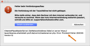 Trotz funktionierender Internetverbindung erhalten einige unserer Kund*innen beim Öffnen der Tauschbörse eine Fehlermeldung. Es wird ein "Protokoll-Fehler (SOCKS Version 5)" oder ein allgemeiner Netzwerkfehler "GetNetworkAddress ... unknown Error" gemeldet.