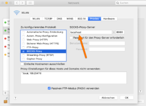 In allen Fällen war ein lokaler Proxy in den Systemeinstellungen des Rechners konfiguriert. Entweder war ein SOCKs-Proxy, wie im Screenshot unten dargestellt, aktiviert. Oder die Option "Automatische Proxy-Entdeckung" war aktiviert. Diese Einstellungen waren jeweils nicht durch die Besitzer*innen der Rechner selbst vorgenommen worden.