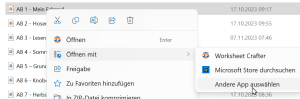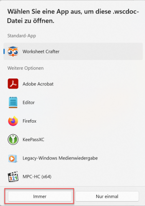 Jetzt öffnet sich ein Windows-Dialog bei dem das Programm festgelegt werden kann mit dem diese Datei standardmäßig geöffnet wird. Wähle den Worksheet Crafter aus und bestätige mit "immer".