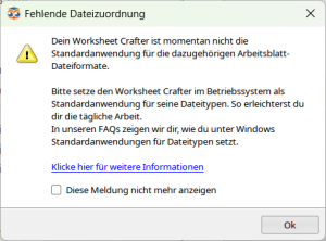 Obwohl die Dateien direkt mit dem Worksheet Crafter geöffnet werden, erkennt der Worksheet Crafter die Zuordnung nicht. Dann setze einfach das Häkchen, dass der Hinweis nicht mehr angezeigt werden soll: