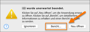 Bei einem Absturz auf dem Mac erscheint typischerweise eine Fehlermeldung, bei der ein "Bericht-Button" vorhanden ist. Dieser Fehlerbericht hilft uns sehr, Problemen auf die Schliche zu kommen. Hier ist ein Beispiel: