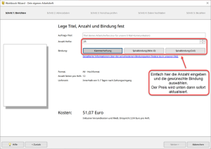 In Schritt 1 kannst du nun ganz unverbindlich mit der Auflage und der Bindungsart experimentieren und den Preis für den Druck der Hefte sehen. Klicke danach einfach auf Abbrechen.