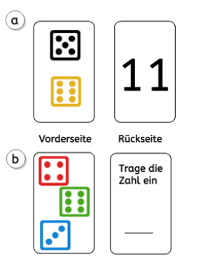 Wenn eure SchülerInnen schon fortgeschrittener sind, steigert ihr den Schwierigkeitsgrad der Zahlkärtchen, indem ihr mehrere Würfel auf einer Karte platziert.
