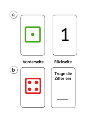 Nutzt die bunten Würfelsymbole, um eigene Zahlkärtchen für eure Klasse zu erstellen. Dafür platziert ihr eine Form wie das abgerundete Rechteck auf eurem Arbeitsblatt und legt dann ein Würfel-Clipart darüber. Ihr könnt die richtige Ziffer entweder schon auf der Rückseite abbilden (a), oder eure SchülerInnen tragen sie selbst dort ein (b).