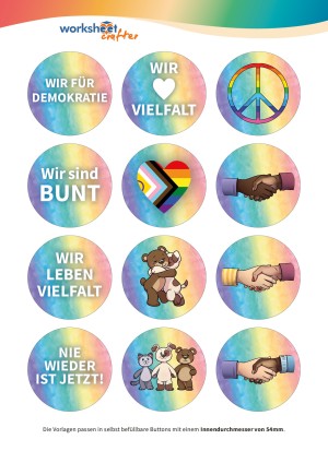 Du möchtest ein Zeichen für Vielfalt setzen, so wie wir auf unseren Messen? Dann lade dir unsere Button-Vorlagen herunter! Einfach ausdrucken, ausschneiden und in selbst befüllbare Buttons einlegen.