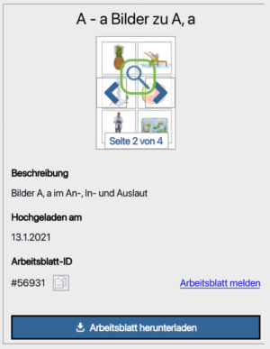 Damit ihr auf einen Blick das Arbeitsblatt und weitere Infos dazu sehen könnt, haben wir die Detail-Ansicht auf der rechten Seiten überarbeitet. Ihr könnt euch ab sofort bereits in dieser Ansicht ein größeres Vorschaubild anschauen und alle Seiten des Arbeitsblatts durchblättern, indem ihr auf die Pfeile an den beiden Rändern des Vorschaubildes klickt. Außerdem wird euch die Seitenanzahl, die Beschreibung, die Arbeitsblatt-ID und das Datum angezeigt. Mehr zur Arbeitsblatt-ID erzählen wir euch weiter unten.