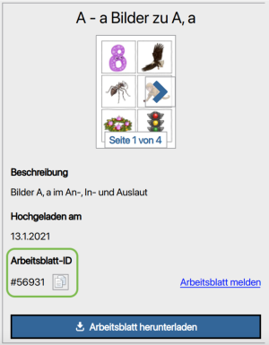Die Arbeitsblatt-ID erleichtert euch den Austausch mit euren Kolleg*innen. Klickt einfach auf den Button neben der ID, um sie in die Zwischenablage zu kopieren. Und fügt sie anschließend in eure E-Mail, Blog oder Instagram-Beitrag ein.