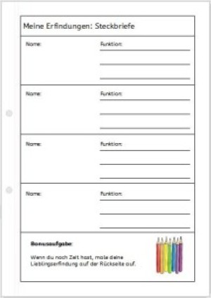 Aus der Aufgabe lässt sich prima ein großes, fächerübergreifendes Projekt (in Deutsch, Kunst und Sachkunde) machen. Dabei suchen sich die Kinder einen der Gegenstände aus und stellen ihn auf einem Plakat ausführlich vor. Dann könnten sie sich zum Beispiel noch überlegen, wie die Erfindung aufgebaut sein soll, wie die einzelnen Bestandteile heißen und was sie kosten soll.
