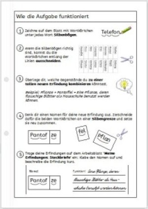 4. Den Erfindungen Namen geben. Für jede Erfindung soll ein Name gesucht werden, der eine Kombination aus den Namen der zwei Gegenstände darstellt. Zum Beispiel Pantofze oder Manfen. Dafür werden die Karten an den Silbenbögengrenzen zerschnitten und neu zusammengesetzt.