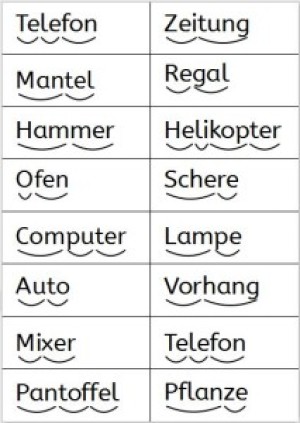 1. Wortkärtchen. Die Schülerinnen und Schüler bekommen Wortkärtchen, auf denen verschiedene mehrsilbige Gegenstände geschrieben sind, zum Beispiel Telefon, Mixer, Auto... Wichtig ist dabei, nur wenige Wörter zu nehmen, die aus mehreren Wortstämmen bestehen, wie beispielsweise Backofen. Bei solchen Wörtern würden wir und die Kinder uns nämlich zu sehr auf die Silbengrenze zwischen den Wortstämmen konzentrieren, also Back-ofen.