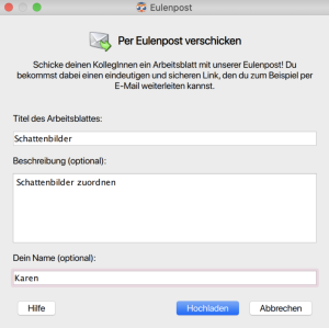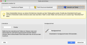 Ein Fenster öffnet sich in dem ihr den Titel eures Arbeitsblattes (erforderlich), eine Beschreibung (optional) und euren Namen (optional) eintragen könnt.