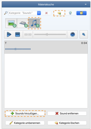 befindet (Notensymbol ist angewählt) könnt ihr eigene Sounds hinzufügen.Klickt dafür im unteren Bereich der Materialsuche auf die Schaltfläche "Sounds