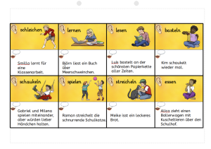 Unser Lesespiel enthält einen Text aus unserem Verben-Materialpaket. Ihr könnt es euch das Material anschauen, indem ihre auf die kleinen Bilder klickt. Herunterladen könnt ihr es dann gleich hier.