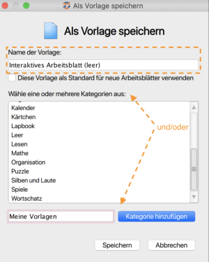 Gebt eurer interaktiven Vorlage einen Titel und wählt eine oder mehrere Kategorien aus. Ihr könnt natürlich auch eine neue Kategorie dafür hinzufügen.