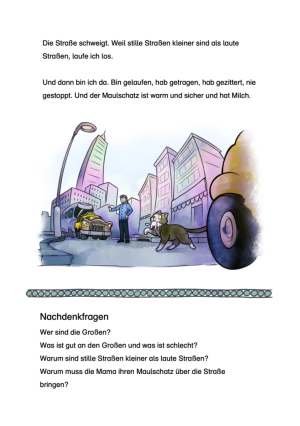 Über die große Straße ist die Geschichte, bei der eure Klasse neben dem Text noch weiteren Input braucht. Die Kids sollen nämlich herausfinden, welches Pfotentier hier eigentlich die Straße überquert und was für einen Schatz es in seinem Maul trägt. Zumindest ohne Illustration ist das für GrundschülerInnen etwas zu schwer, daher könnt ihr die Geschichte hervorragend als Rätselgeschichte einsetzen.