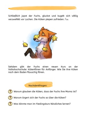 Was eure Kinder dabei üben: Wir haben an einigen Stellen der Geschichte mit der Orthographie gespielt: In der Kükensprache haben sich kleine Rechtschreibfehler eingenistet. Entdecken eure Kinder alle? Und können sie die Wörter richtig schreiben?