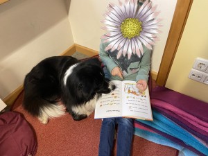 Auch als Lesehund setze ich ihn häufiger ein: Unsichere Kinder lesen ihm gerne vor, da er völlig wertfrei einfach da ist und zuhört. Meistens mit seiner Schnauze auf dem Schoß – oft schläft er dabei auch ruhig ein. Die Kinder werden dadurch sicherer und selbstbewusster.