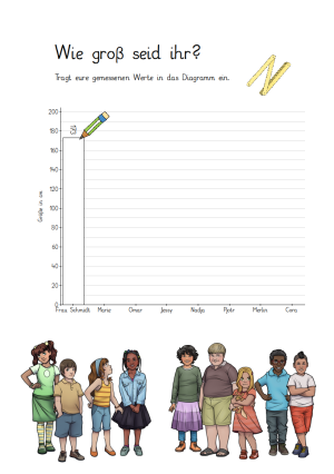 Anhand der Diagramme lernen eure Schüler*innen dann Daten und Fakten aus den Schaubildern herauszulesen oder andersherum: Daten in eine grafische Form zu bringen. Ihr könnt im Unterricht Tiere zählen, Körpermaße vergleichen oder Umfragen darstellen. Was fällt euch noch ein? Wir sind gespannt auf eure Umsetzung.